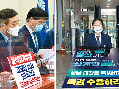 與 “고발사주 규명” vs 野 “대장동 특검” 여야 지도부가 7일 ‘대장동 의혹’과 ‘고발사주 의혹’을 두고 맞붙었다. 더불어민주당 윤호중 원내대표와 박완주 정책위의장(왼쪽 사진 왼쪽부터)이 이날 국회에서 열린 국정감사 대책회의에서 ‘윤석열 게이트’라고 적힌 팻말을 앞세운 채 발언하고 있다. 오른쪽 사진은 이날 서울 서대문구 국가수사본부에서 대장동 의혹의 …