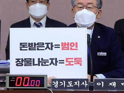 더불어민주당 대선후보인 이재명(오른쪽) 경기지사가 18일 경기도청에서 열린 국회 행정안전위원회의 경기도 국정감사에서 피켓을 든 채 의원 질의에 답하고 있다. 수원=국회사진기자단. 더불어민주당 대선후보인 이재명(오른쪽) 경기지사가 18일 경기 수원시 경기도청에서 열린 국회 행정안전위원회의 경기도 국정감사에서 김용판 국민의힘 의원과 인사하고 있다. 국회사진기자…