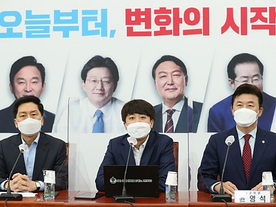 국민의힘 이준석 대표가 1일 서울 여의도 국회에서 열린 최고위원회의에서 발언하고 있다. 회의실 배경판에는 이날부터 대선후보 선출 모바일투표가 진행되는 후보들의 사진이 걸려 있다. 국민의힘 대선 후보 선출을 위한 당원 투표가 1일 시작과 함께 폭발적 관심을 얻고 있다. 당 사무처 등에 따르면 당원 투표율은 이날 오후 5시 기준 43.82%를 기록했다. 지난 …