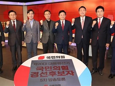 ▲ 국민의힘 대선 예비후보들이 1일 오후 서울 중구 매경미디어센터에서 열린 대선 경선 5차 방송토론회에서 기념촬영을 하고 있다. 왼쪽부터 유승민, 황교안, 하태경, 최재형, 원희룡, 윤석열, 안상수, 홍준표 후보. 국민의힘 대선주자인 원희룡·유승민·윤석열·홍준표(가나다순) 후보가 8일 2차 예비경선(컷오프)을 통과하며 4강 문턱을 넘었다. 국민의힘 선거관리…
