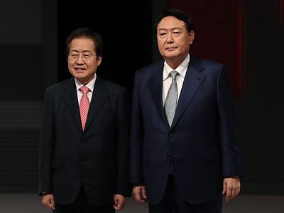 국민의힘 대권 주자 윤석열 전 검찰총장과 홍준표 의원이 15일 서울 마포구 상암동 MBC 사옥에서 열린 일대일 맞수토론에 앞서 포즈를 취하고 있다. 국회사진기자단 국민의힘 대권 주자 첫 일대일 맞수 토론 국민의힘 대권 주자 윤석열 전 검찰총장과 홍준표 의원이 일대일 맞수 토론에서 격돌했다. 홍 의원은 윤 전 총장의 ‘가족 리스크’를 언급하며 “그런 식으로 …
