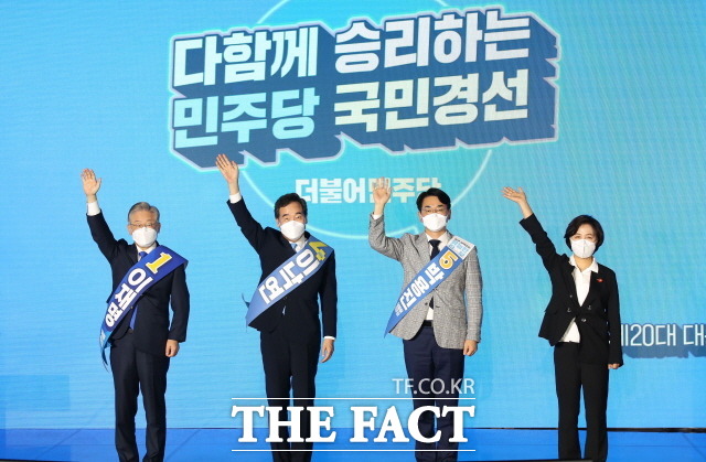 이재명 경기지사가 제주 경선에서도 누적 집계에서 2위인 이낙연 전 대표와 격차를 벌렸다. 1일 오후 제주시 오등동 호텔난타에서 열린 더불어민주당 대선 후보 선출을 위한 제주 합동연설회에 앞서 기념촬영하고 있는 더불어민주당 대선 경선 후보들. 왼쪽부터 이재명, 이낙연, 박용진, 추미애 후보.