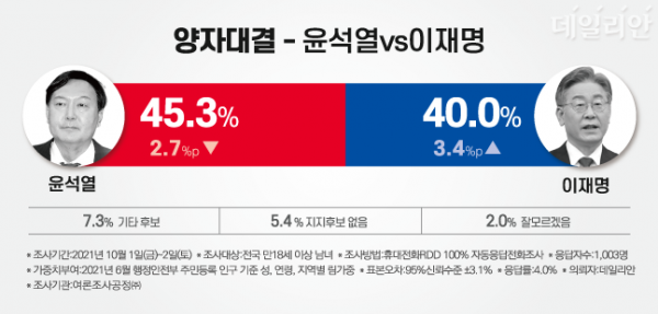 더불어민주당 대선후보로 이재명 경기도지사, 국민의힘 대선후보로 윤석열 전 검찰총장을 가상해 양자대결을 할 경우 이재명 지사 40.0%, 윤석열 전 총장 45.3%로, 두 후보 사이의 격차는 오차범위 내였다.