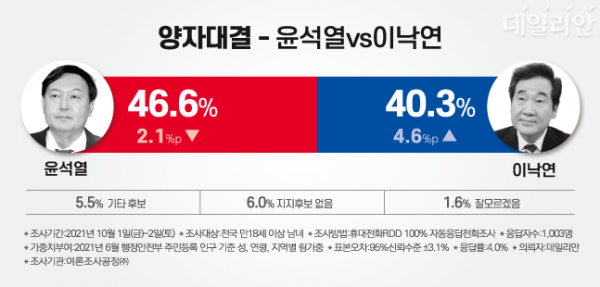 윤석열 46.6% vs 이낙연 40.3%