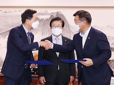 지난 8월31일 서울 여의도 국회 의장실에서 더불어민주당 윤호중 원내대표(오른쪽)와 국민의힘 김기현 원내대표(왼쪽)가 언론중재법 개정안을 위한 합의문을 교환하고 있다. 특정 매체와 그 조직에 소속된 개인을 동일시하지 않으려 노력하는 편이다. 기자 개인에 대한 평가는 그가 남긴 결과물(기사)이 최소한의 윤리를 지켰는지, 적어도 기자 개인의 양심에 입각해 보도…