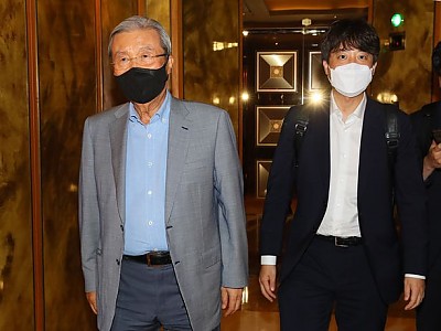 국민의힘 이준석 대표(오른쪽)와 김종인 전 비상대책위원장이 지난 6월 29일 서울 중구 한 호텔 식당에서 만찬 회동을 마치고 나오고 있다. 김종인 전 국민의힘 비대위원장이 입당 후 지지율 하락세를 보이는 윤석열 전 검찰총장에 관해 “그래서 입당하는 날 아침에 서두르지 말라고 했었다”고 말했다. 김 전 위원장은 이준석 대표를 향해서는 “이번 대선 이기지 못하…