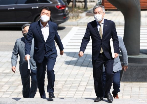 '고발사주' 의혹의 당사자인 열린민주당 최강욱 대표(오른쪽)와 황희석 최고위원이 지난 13일 윤석열 전 검찰총장 등에 대한 고소장 접수를 위해 서초동 대검찰청으로 들어서는 모습.