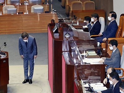 더불어민주당 이낙연 의원이 15일 서울 여의도 국회 본회의에서 자신의 사직안 표결에 앞서 의원들에게 인사하고 있다. 더불어민주당 대선주자인 이낙연 전 민주당 대표의 국회의원 사직안이 15일 국회 본회의를 통과했다. ‘정치 1번지’인 종로구 국회의원직을 던진 이 전 대표는 다시 신발끈을 조이고 추석 직후 열리는 호남 경선에서 역전의 발판을 마련하겠다는 각오다…