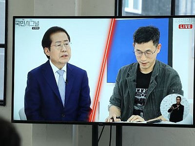 9일 서울 금천구 즐스튜디오에서 열린 국민의힘 대선 경선 후보 '국민 시그널 면접'에 참가한 홍준표 후보(왼쪽)와 면접관으로 참가한 진중권 전 동양대 교수의 모습이 한 화면에 보이고 있다. 국회사진기자단 국민의힘 대권 주자들이 혹독한 내부 면접을 치렀다. 홍준표 의원은 면접관으로 나선 진중권 전 동양대 교수와 설전을 벌였다. 국민의힘은 9일 서울 금천구의 …