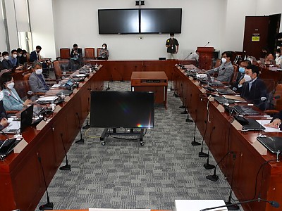 9일 국회 제5회의장에서 언론중재 및 피해구제 등에 관한 법률(언론중재법)' 개정안 여야 협의체 회의가 열리고 있다. 왼쪽부터 시계방향 국민의힘 최형두, 전주혜 의원, 문재완 한국외국어대 법학전문대학원 교수, 송현주 한림대 미디어스쿨 교수, 김필성 변호사, 더불어민주당 김용민, 김종민 의원. 신희석 연세대 법학연구원 박사는 참석하지 않았다. 국회사진기자단 …