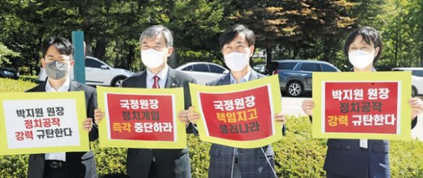 野, 국정원 항의방문 - 국회 정보위원회 소속 국민의힘 하태경(오른쪽에서 둘째)·조태용(왼쪽에서 둘째) 의원과 보좌진이 15일 서울 내곡동 국가정보원 앞에서 “박지원 국정원장은 정치 개입을 중단하라”며 항의 시위를 하고 있다.