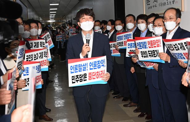국민의힘 이준석 대표와 의원들이 19일 서울 여의도 국회 문화체육관광위원회 앞에서 더불어민주당의 언론중재법 개정 시도에 대해 규탄하고 있다.
