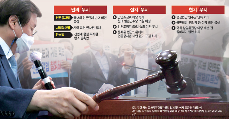 더불어민주당이 시민단체와 야당, 재계의 반대가 거셌던 언론중재 및 피해구제 등에 관한 법률(언론중재법)·사립학교법 개정안, 기후위기 대응을 위한 탄소중립 녹색성장법(탄소중립법) 등 3개 법안 처리를 다수의 힘으로 밀어붙였다. 정치권 안팎에서는 오만한 거여(巨與)의 입법 농단이라는 비판과 함께 ‘민의·법절차·협치’를 모두 무시한 ‘3無 여당’이라는 지적이 쏟아지고 있다.