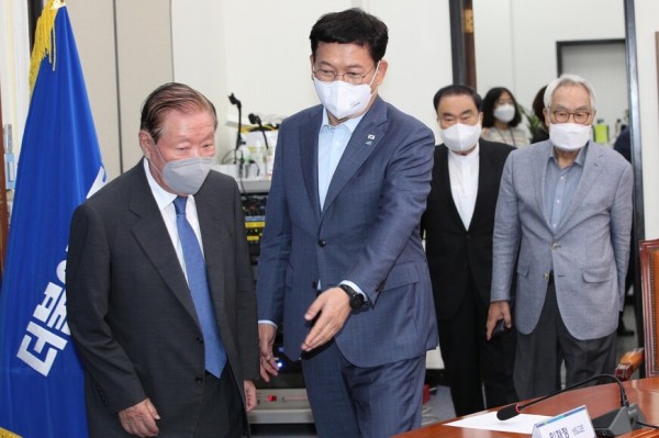 송영길 더불어민주당 대표가 6일 서울 여의도 국회에서 열린 ‘상임고문단 회의’에서 김원기 상임고문에게 자리를 안내하고 있다. 상임고문단 회의에서는 최근 네거티브 공방이 과열되고 있는 민주당 대선 후보 경선을 두고 우려와 쓴소리가 쏟아져나왔다. 공동취재사진