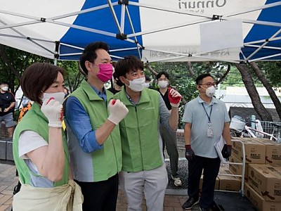 국민의힘 대선 경선 예비후보자들이 4일 오전 서울 용산구 동자동 쪽방촌을 찾아 삼계탕과 물을 혹서기 취약계층에게 나눠주는 자원봉사 행사를 가졌다. 최재형 후보 부인 이소연씨(왼쪽부터), 장성민 후보, 이준석 대표가 봉사활동에 앞서 포즈를 취하고 있다. 국회사진기자단. 윤석열 국민의힘 대선 예비후보가 4일 오전 청와대 앞 분수대에서 드루킹 대선 여론 조작에 …