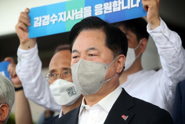 김두관 더불어민주당 의원이 21일 오전 경남도청 앞 정문에서 김경수 도지사 지지자들과 함께 플래카드를 들고 있다.