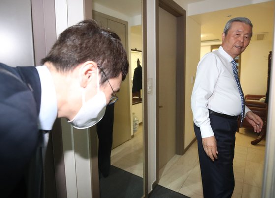 국민의힘 당대표 주자인 김웅 의원이 지난 4월 7일 오전 서울 종로구 사직로 대한발전전략연구원에서 조언을 구하기 위해 김종인 전 비상대책위원장을 찾아 인사하며 들어서고 있다. 뉴시스