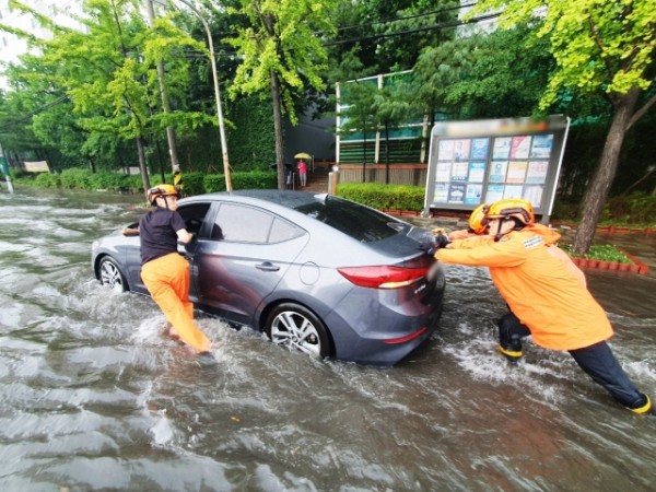 지난 8일 오후 인천에 강하게 내린 비로 인해 미추홀구 용현동 한 도로에서 차량이 침수돼 신고를 받고 출동한 소방당국이 안전조치를 하고 있다. 인천소방본부 제공.