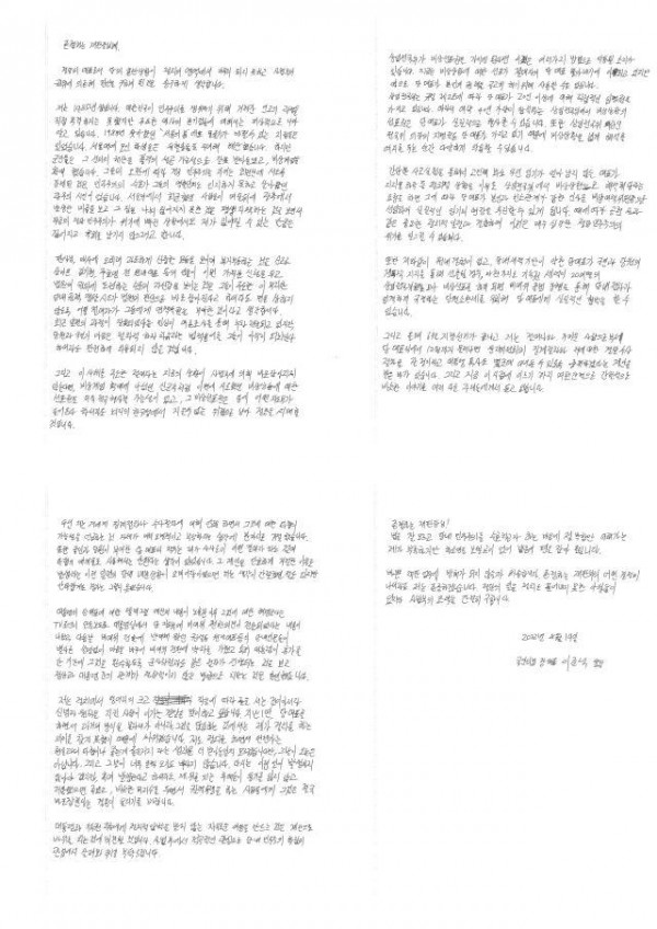 이 전 대표는 이날 SNS에 "'열람용' (표시가) 없는 건 저만 가지고 있을 것"이라며 2,385자 자필 탄원서 전문을 공개했다. 이 탄원서는 이 전 대표가 지난 19일 당 비상대책위원회 효력정지 가처분 신청 담당 재판부인 서울남부지법 민사51부(황정수 수석부장판사)에 제출한 것이다.