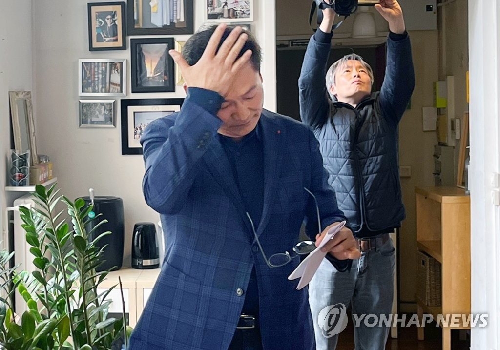 (파리=연합뉴스) 현혜란 특파원 = 더불어민주당 송영길 전 대표가 22일(현지시간) 파리 3구 한 사무실에서 한국 특파원들과 만나 2021년 전당대회 돈 봉투 의혹과 관련해 입장을 밝히고 있다. 2023.4.22