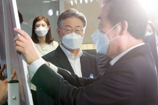 더불어민주당 대선 예비후보인 이재명 경기도 지사가 지난 7월28일 오전 서울 여의도 중앙당사에서 열린 제20대 대선 후보자 ‘원팀’협약식에서 핵심공약 원팀 퍼즐 맞추기 퍼포먼스를 하는 이낙연 전 대표를 바라보고 있다.