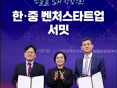 한·중 벤처 스타트업 서밋 개최…한국벤처투자(KVIC)-CMBI 글로벌펀드 체결식한·중 벤처스타트업과의 대화,한·중 투자 컨퍼런스진행한성숙,“정상외교 계기로 스타트업과 벤처투자 협력으로 구체화”…지난 7일 중소기업벤처부 한성숙 장관(가운데)는 중국 상해에서 ‘한중 벤처 스타트업 서밋’에 참석해 한국벤처투자(KVIC)-CMBI 글로벌펀드 체결식을 진행했다.(…