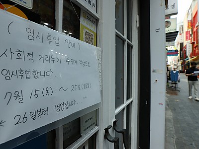 지난 21일 오후 서울 중구 명동의 한 가게에 사회적 거리두기 4단계 격상으로 인한 임시휴업 안내문이 붙어있다. 5시 40분에 와서 “조금만 있다 가겠다” ‘쪼개기 부탁’에 난감한 자영업자들 “손님과 얼굴 붉히기 싫어 6시 문 닫기도” 신종 코로나바이러스 감염증(코로나19) 방역 대책의 일환으로 시행되고 있는 ‘오후 6시 이후 3인 이상 사적 모임 금지’로…