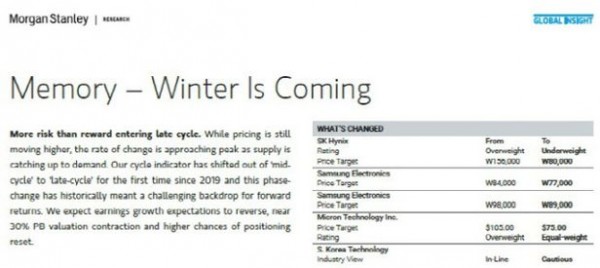 모건스탠리는 지난 11일 ‘겨울이 오고 있다(Winter Is Coming)’ 제목의 리포트를 통해 “D램 업황은 활력을 잃고 있다”며 주요 메모리반도체 제조사들의 목표 주가를 하향 조정했다.