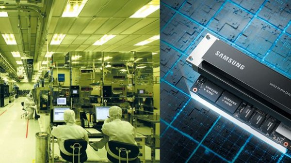 SK하이닉스의 D램 반도체 제조시설(왼쪽)과 삼성전자의 낸드 플래시 메모리를 사용한 데이터센터용 SSD(솔리드 스테이트 드라이브·오른쪽)