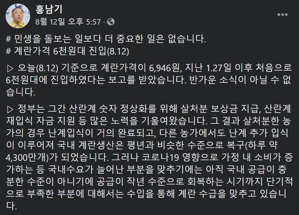 홍남기 경제부총리 겸 기획재정부 장관이 지난 12일 페이스북에 달걀값이 6000원대로 진입했다는 글을 올렸다. /페이스북 캡처