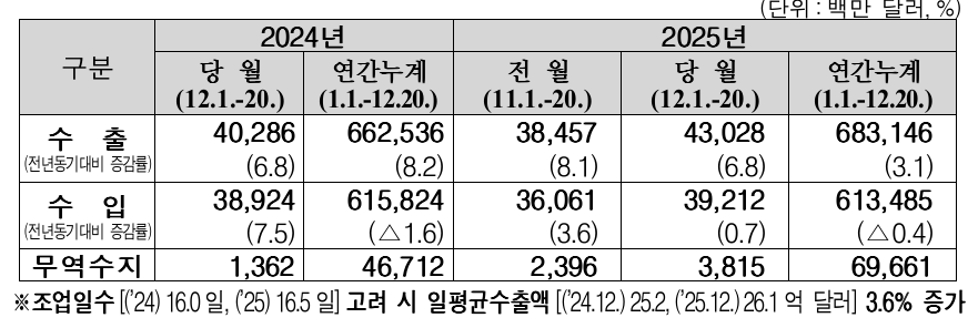 관세청, 2025년 12월 1일 ~ 12월 20일 수출입 현황(잠정치) 발표