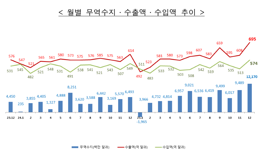 (뉴스9=이호철기자) 관세청은 15일 2025년 12월 월간 수출입 현항 확정치를 발표했다. 전년 동월 대비 수출은 13.3% 증가한 695억 달러, 수입은 4.6% 증가한 574억 달러로, 무역수지는 122억 달러 흑자를 기록하였다.