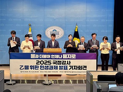 민생회복 최우선, 죽지않는 일터, 갑질없는 공정 거래‘을’을 위한 국감이 되어야..2025년도 국정감사 대비 을지로위원회 기자회견'(사진=진성준 의원실)(뉴스9=이호철 기자) 더불어민주당이 오는 13일 시작하는 국정감사에서 홈플러스 대주주인 사모펀드 MBK파트너스와 배달앱 플랫폼 등을 집중 공략하겠다고 1일 밝혔다. 당내 민생 문제를 담당하는 ‘을지키는민생…