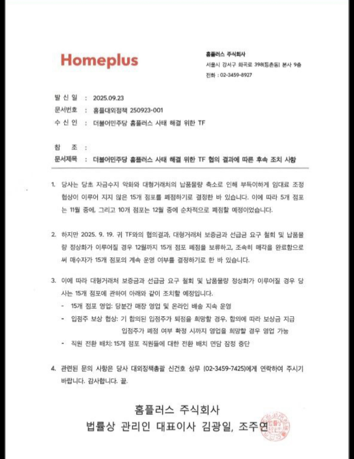 하지만 지난 19일 더불어민주당 MBK홈플러스사태해결TF(단장:유동수 의원/인천 계양갑)에 대형거래처 보증금과 선납금 요구 철회 및 납품물량 정상화가 이루어 질 경우 12월까지 15개 점포 폐점을 보류하고 , 조속히 매각을 완료함으로써 매수자가 15개 점포 의 계속 운영여부를 결정하기로 한 바 있다.