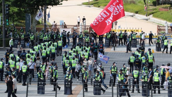 광복절인 15일 예고된 국민혁명당 집회는 경찰의 원천봉쇄로 모두 차단됐으나, 일부 보수단체 회원들이 산발적으로 1인 시위를 강행한 가운데 서울 종묘공원 앞에서 경찰들이 집회를 막고 있다.