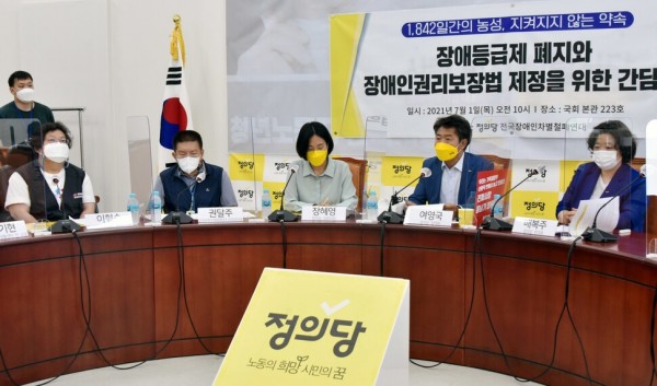 2021년 7월1일 정의당과 전국장애인차별철폐연대 공동주최로 국회에서 열린 ‘장애등급제 폐지와 장애인권리보장법 제정을 위한 간담회’. 공동취재사진.