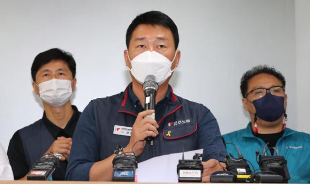서울 도심에서 불법 집회를 주도한 혐의를 받는 양경수 전국민주노동조합총연맹(민주노총) 위원장이 지난 11일 오전 서울 중구 정동 민주노총에서 구속 전 피의자 심문(영장실질심사) 불출석 등에 대한 입장을 밝히고 있다.