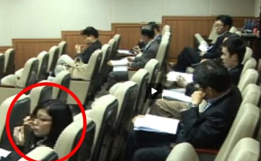 ▲ 사진은 정경심 변호인단이 서울대 학술대회 동영상에 등장한 빨간 동그라미 속 인물이 딸 조민씨라며 공개한 동영상 캡처본.