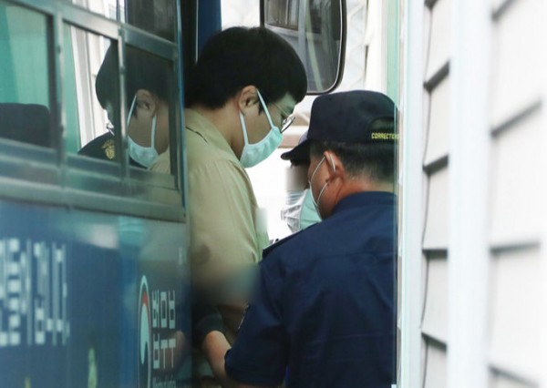 구속 상태인 왕기춘 선수가 재판을 받기 위해 수의 차림으로 법정에 출석하는 모습.