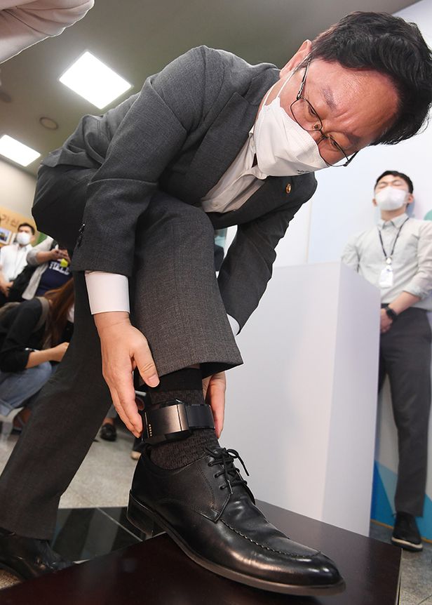 전자 발찌 차보는 朴장관 - 박범계 법무장관이 26일 서울 동대문구에 있는 법무부 위치추적중앙관제센터를 방문해 전자 발찌를 시험 착용해보고 있다.