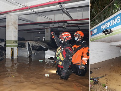 119구조대원들이 7일 제11호 태풍 힌남노에 따른 폭우로 침수된 경북 포항시 남구의 한 아파트 지하주차장에서 실종자 구조 당시 상황을 설명하고 있다. 오른쪽 사진은 이날 오전 배수작업으로 물이 줄어든 지하주차장 입구 제11호 태풍 힌남노가 퍼부은 집중호우 탓에 한 지하주차장에서만 7명의 사망자가 발생한 경북 포항 남구의 아파트 주변은 거대한 뻘처럼 변해 …