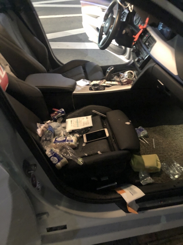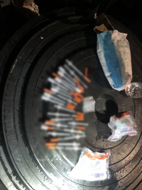 남성의 차에서 발견된 수십 개의 주사기. 경찰이 마약 의심 정황을 묻자 돌발행동을 보이기도 했다.