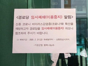 14일 부산 기장군 정관읍 한 아파트 내 경로당 입구에 임시폐쇄를 알리는 안내문이 붙어 있다. 기장군 제공