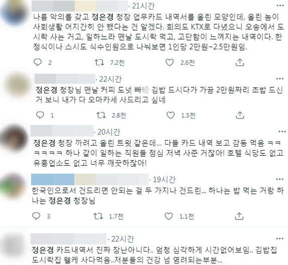 정은경 질병관리청장이 사용한 올해 6월 업무추진비 사용내역이 온라인에서 공개된 뒤 “고단함이 느껴진다” “맛있는 것 좀 사드시라” 등의 응원이 줄을 잇고 있다.