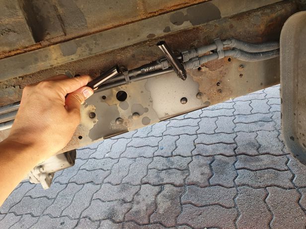 17일 오전 광주 SPC 공장에서 빵을 싣고가던 대체 기사 A씨의 화물차 하부 연료공급선이 예리한 도구로 잘려 있다. 바닥엔 연료가 흘렀다. /A씨 제공