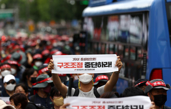 지난 3일 종로3가에서 민주노총 조합원들이 노동법 전면 개정 등을 요구하며 도로를 점거한 채 전국노동자대회를 열고 있다. 연합뉴스