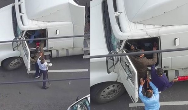 당시 장면을 포착한 영상을 보면 거대한 화물트럭이 줄지어 서있는 차량 사이로 갑자기 파고든다. 경적 소리가 요란하게 울리고, 한 주민은 화물트럭에 밀린 주황색 차량 위로 올라가 트럭 운전자에게 멈추라는 신호를 보낸다. 다른 주민들도 합세해 트럭 운전자를 말린다.