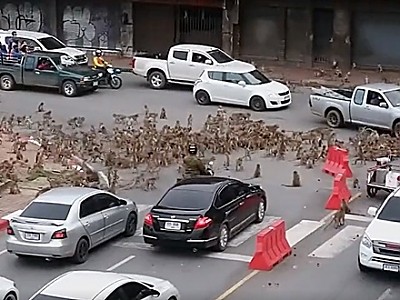 ▲ 25일 저녁, 롭부리 시내의 한 교차로에서 두 원숭이 패거리가 맞붙었다. 서로를 노려보며 한참을 대치하던 원숭이 수백 마리는 급기야 도로를 점거하고 집단 난투극을 벌였다. 태국 원숭이들이 또 패싸움을 벌였다. 26일 현지 매체 ‘타이랏’은 태국 중남부 롭부리에서 원숭이 패거리 간 집단 난투극이 벌어져 교통이 마비됐다고 보도했다. 25일 저녁, 롭부리 시…