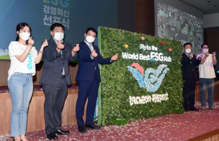 23일,인천국제공항 ESG 경영혁신 선포식에 참석한 임직원들이 이해관계자 참여형 ESG 조형물 완성후 협력을 다짐하며 기념촬영을 하고 있다. 인천공항은 저탄소 친환경 공항, 사람 중심의 사회책임 경영, 투명?공정한 지배구조를 실현함으로써 RE100, 신규 일자리 창출 12만명, 종합 청렴도 1등급을 달성하여 세계 최고 ESG 허브로 비상할 계획이다. 왼쪽부터 이승희(MZ세대 직원대표), 손의태(상주직원대표),김경욱(사장), 김길성(감사),이창근(국민대표)./영종도=이호재기자. 2021.06.23